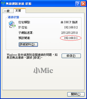 一般而言,在無線網路連線的狀態下,點兩下桌面右下角的無線網路連線小圖示,預設匣道就是連無線 AP的 IP位址,如下圖範例:預設匣道為 192.168.0.1 則於網址列輸入 http://192.168.0.1/ 方能連進無線 AP設定頁面。
