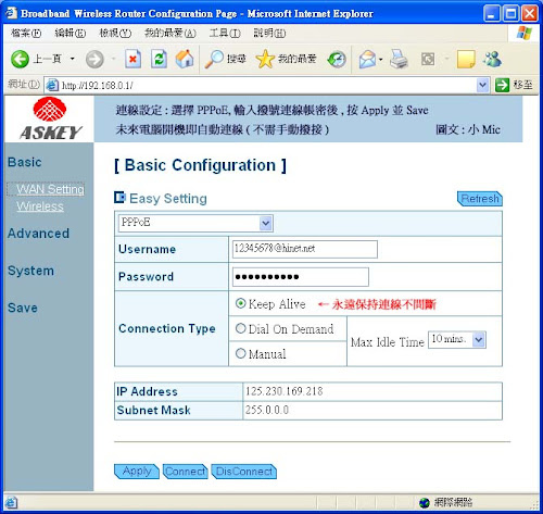以我家的無線寬頻分享器 ASKEY PDW030為例:LAN介面的 IP為 192.168.0.1,在網址處輸入 http://192.168.0.1/ 則跳出連線帳密視窗,輸入連線帳密後即可進入設定頁面。