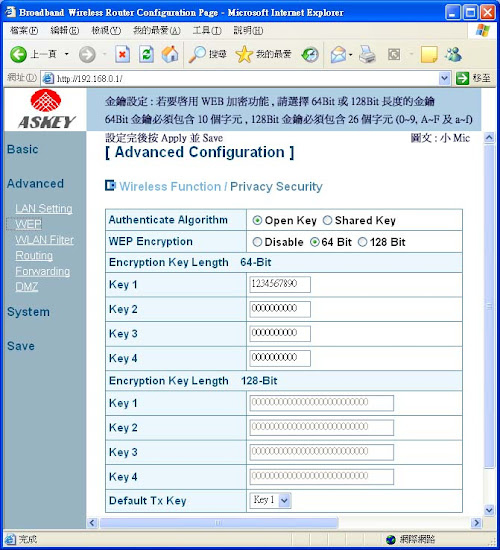 ps: 無線寬頻分享器記得設定使用者金鑰,以免被收的到訊號的鄰居連線佔用頻寬。